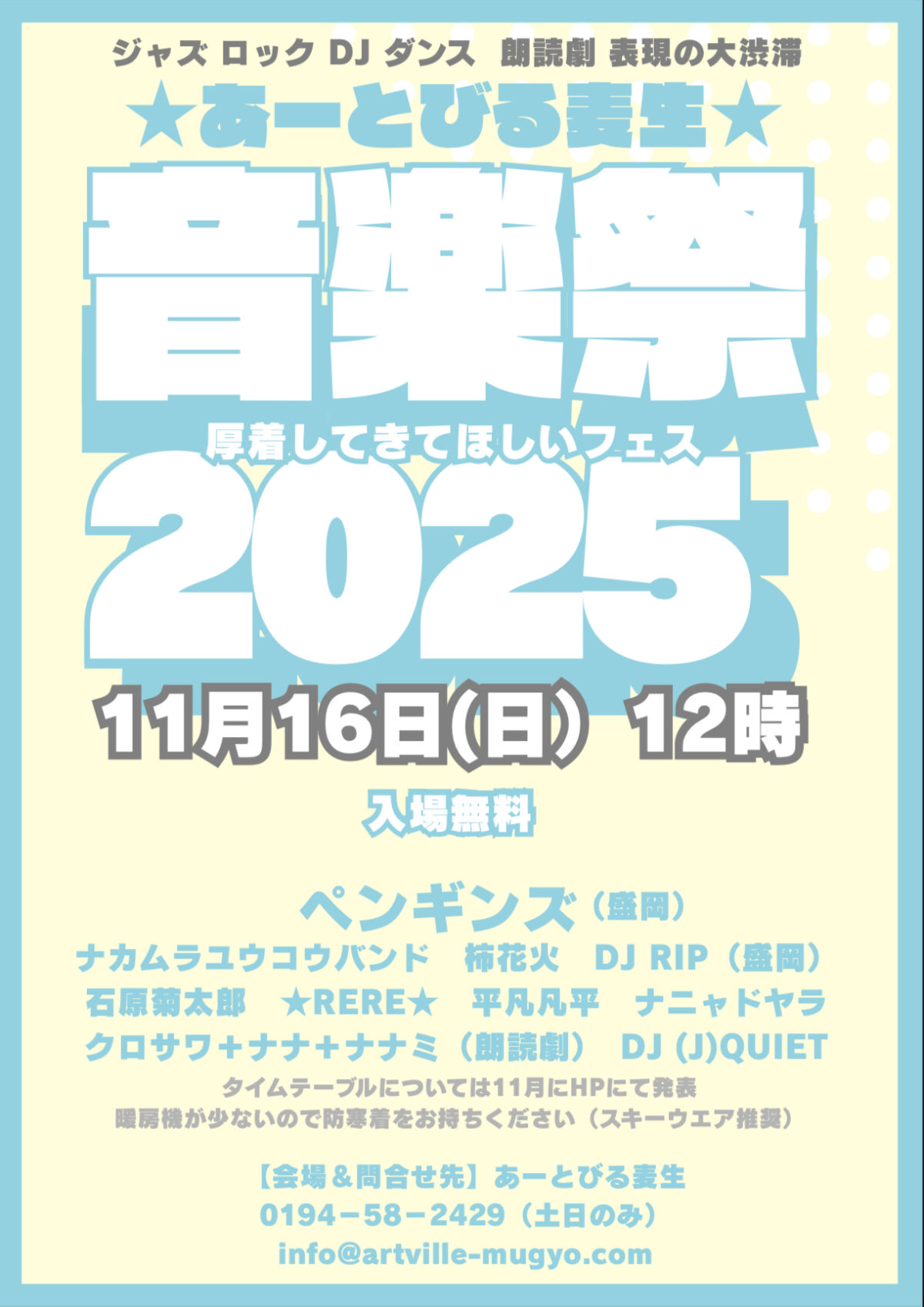 【音楽祭2025】11月16日(日) あーとびる麦生音祭2025-厚着をしてきてほしいフェス-を開催いたします。